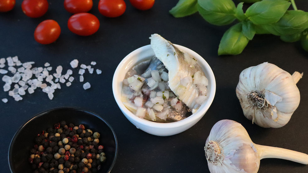 Filety śledziowe (śledź atlantycki, woda, sól), cebula, olej rzepakowy, kilka kropli octu, przyprawy: pieprz, ziele angielskie, liść laurowy.